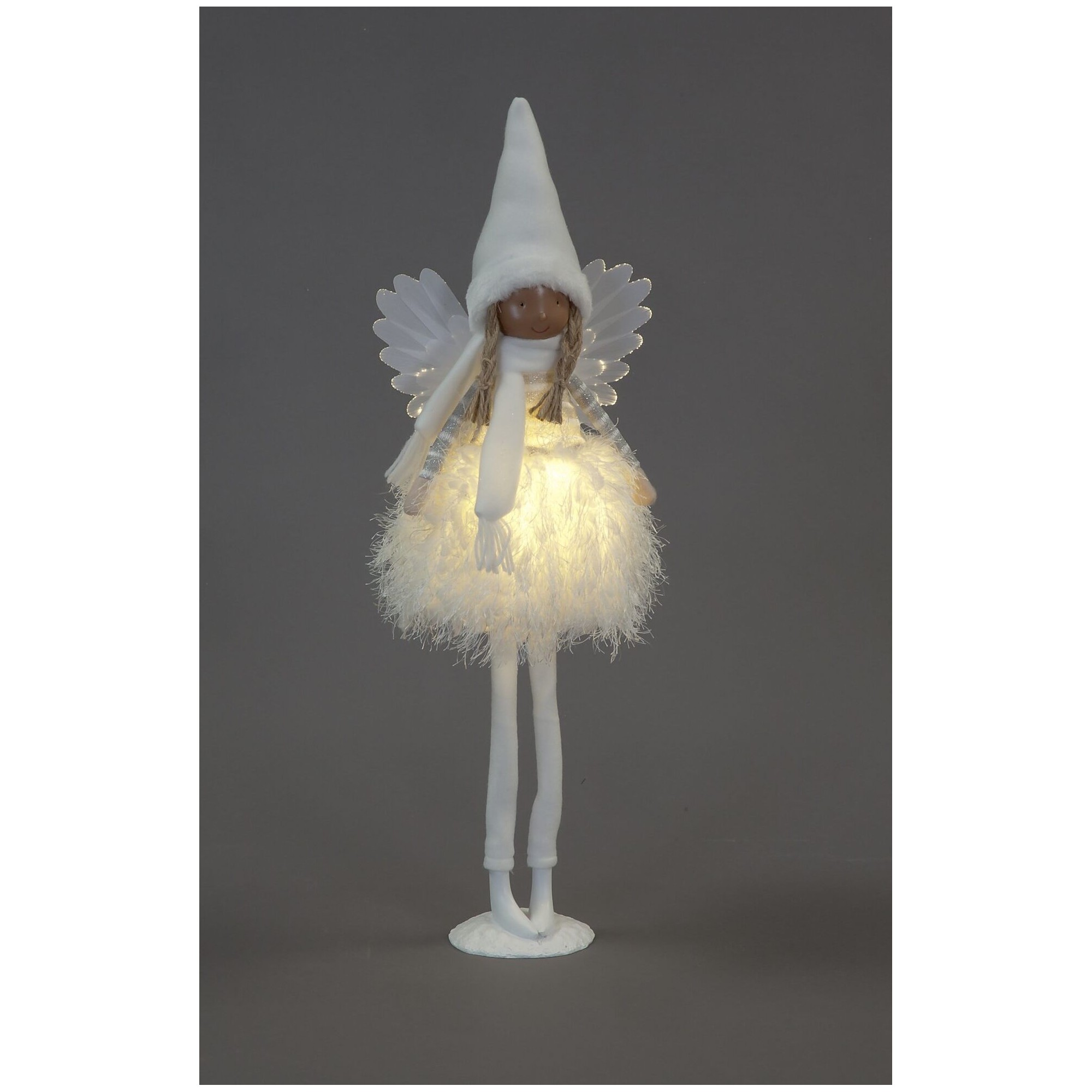 Our standing white angel features a white bobble hat, scarf, wings and long thin white legs