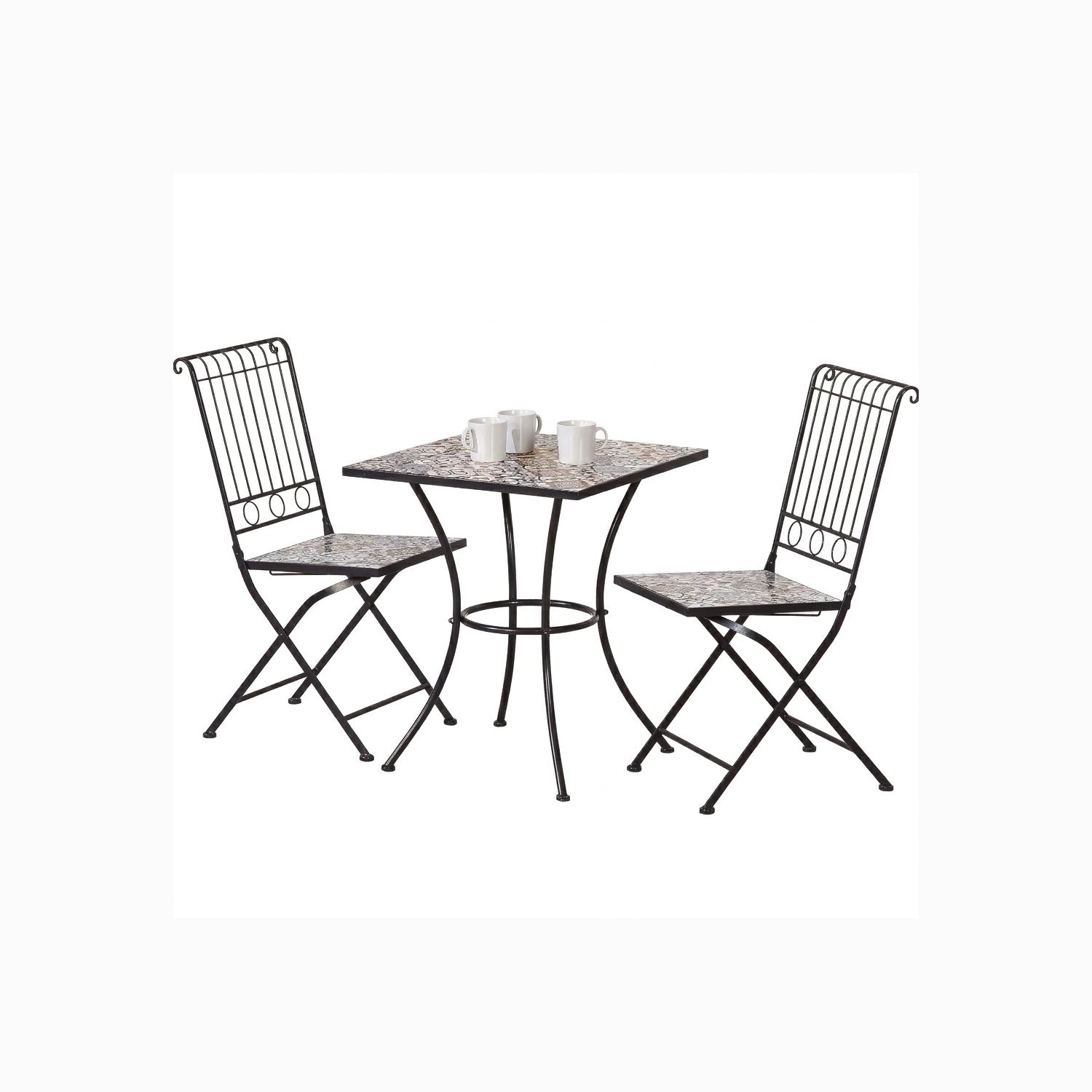 Crafted with a sturdy black-painted metal frame, this set offers durability and timeless elegance. The mosaic detailing adds a touch of Mediterranean-inspired artistry, making it a stylish and functional addition to any outdoor setting.